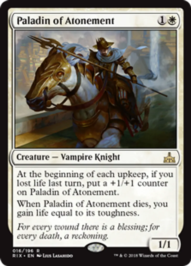 | Oracle Text | At the beginning of each upkeep, if you lost life last turn, put a +1/+1 counter on Paladin of Atonement. When Paladin of Atonement dies, you gain life equal to its toughness. | ||