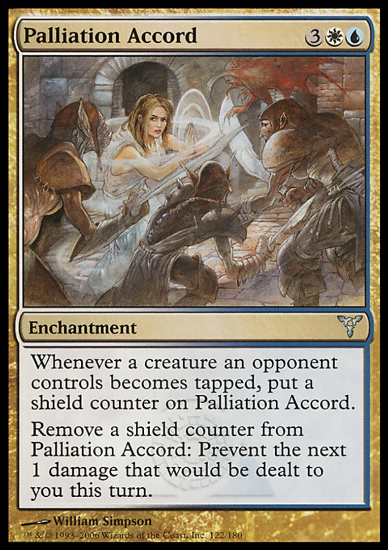 | Oracle Text | Whenever a creature an opponent controls becomes tapped, put a shield counter on Palliation Accord. Remove a shield counter from Palliation Accord: Prevent the next 1 damage that would be dealt to you this turn. | ||