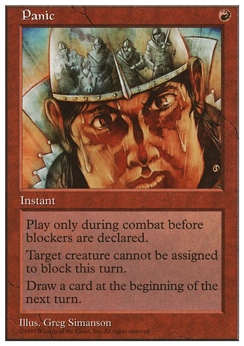 | Oracle Text | Cast Panic only during combat before blockers are declared. Target creature can't block this turn. Draw a card at the beginning of the next turn's upkeep. | ||