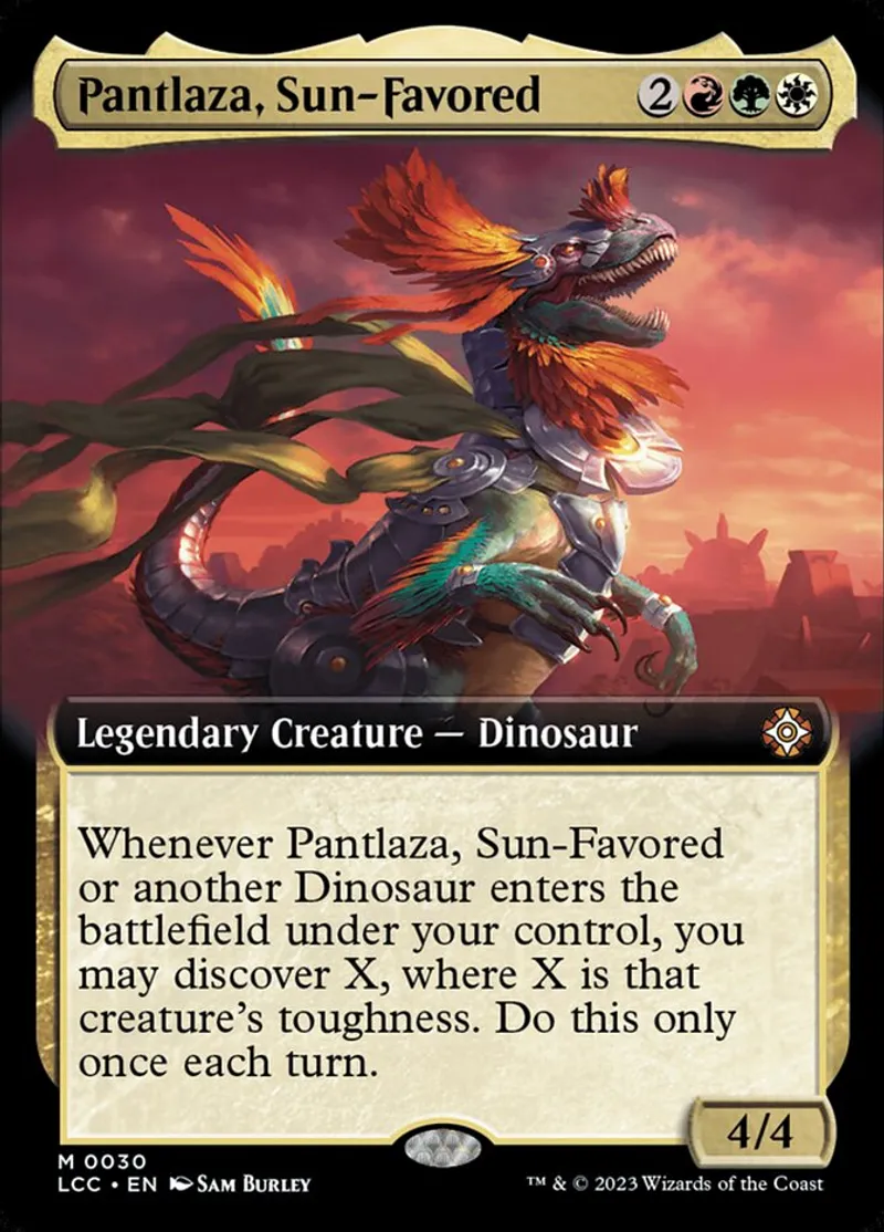 | Oracle Text | Whenever Pantlaza, Sun-Favored or another Dinosaur enters the battlefield under your control, you may discover X, where X is that creature's toughness. Do this only once each turn. (Exile cards from the top of your library until you exile a nonland card with that mana value or less. Cast it without paying its mana cost or put it into your hand. Put the rest on the bottom in a random order.) | ||