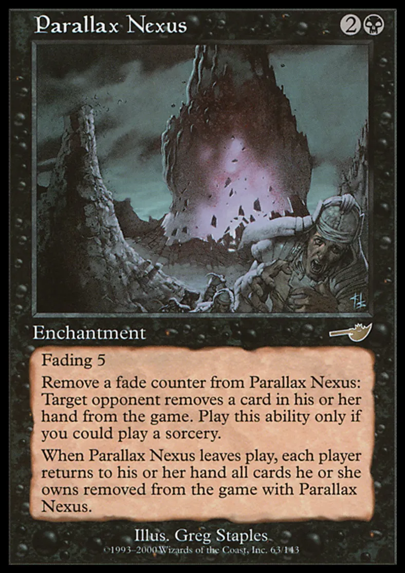 | Oracle Text | Fading 5 (This enchantment enters the battlefield with five fade counters on it. At the beginning of your upkeep, remove a fade counter from it. If you can't, sacrifice it.) Remove a fade counter from Parallax Nexus: Target opponent exiles a card from his or her hand. Activate this ability only any time you could cast a sorcery. When Parallax Nexus leaves the battlefield, each player returns to his or her hand all cards he or she owns exiled with Parallax Nexus. | ||