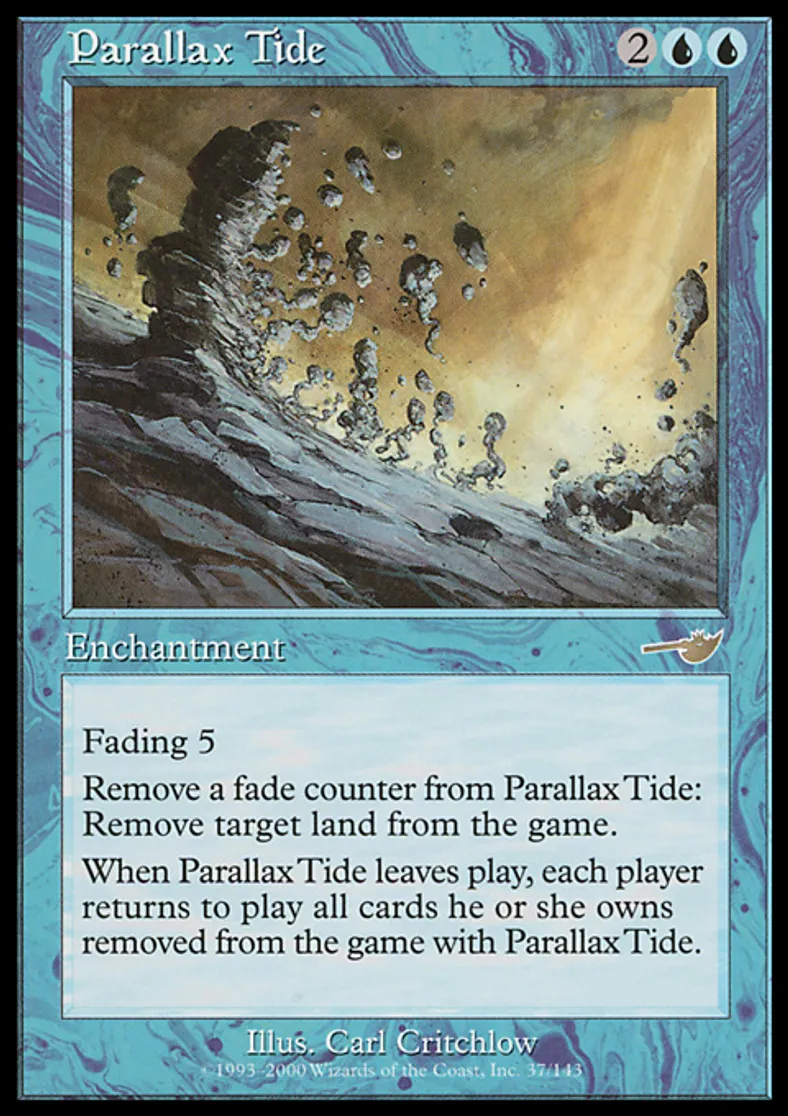 | Oracle Text | Fading 5 (This enchantment enters the battlefield with five fade counters on it. At the beginning of your upkeep, remove a fade counter from it. If you can't, sacrifice it.) Remove a fade counter from Parallax Tide: Exile target land. When Parallax Tide leaves the battlefield, each player returns to the battlefield all cards he or she owns exiled with Parallax Tide. | ||