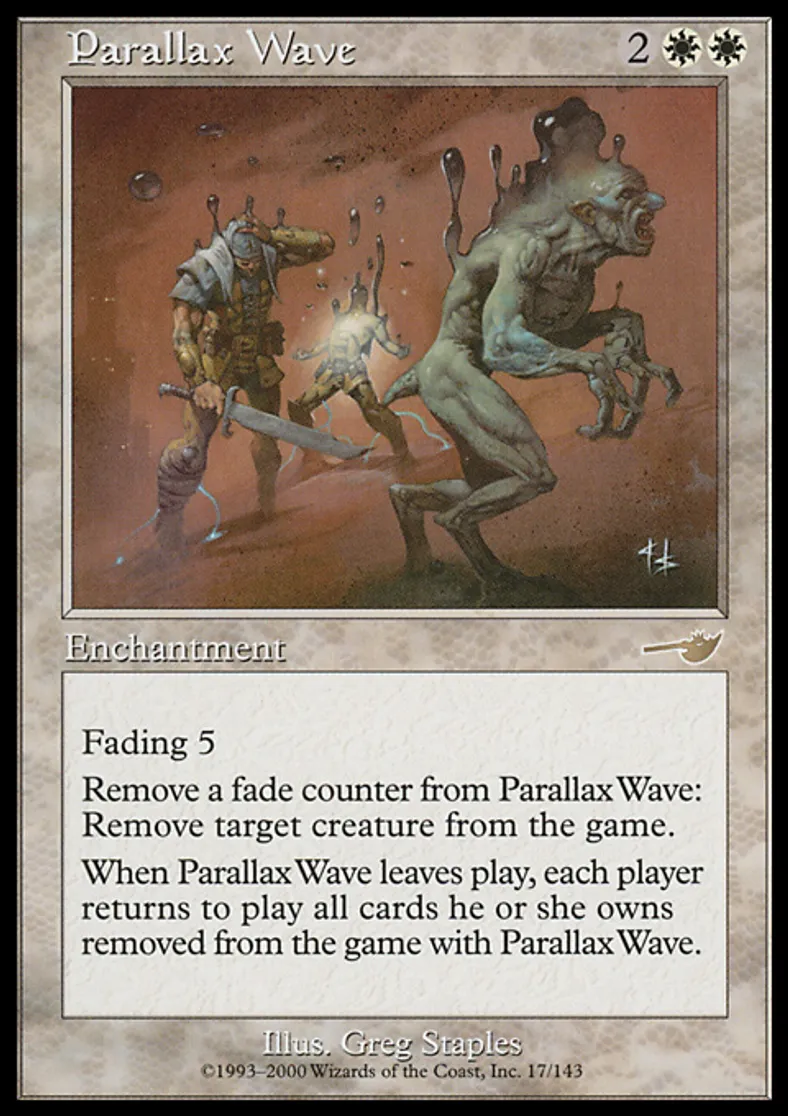 | Oracle Text | Fading 5 (This enchantment enters the battlefield with five fade counters on it. At the beginning of your upkeep, remove a fade counter from it. If you can't, sacrifice it.) Remove a fade counter from Parallax Wave: Exile target creature. When Parallax Wave leaves the battlefield, each player returns to the battlefield all cards he or she owns exiled with Parallax Wave. | ||