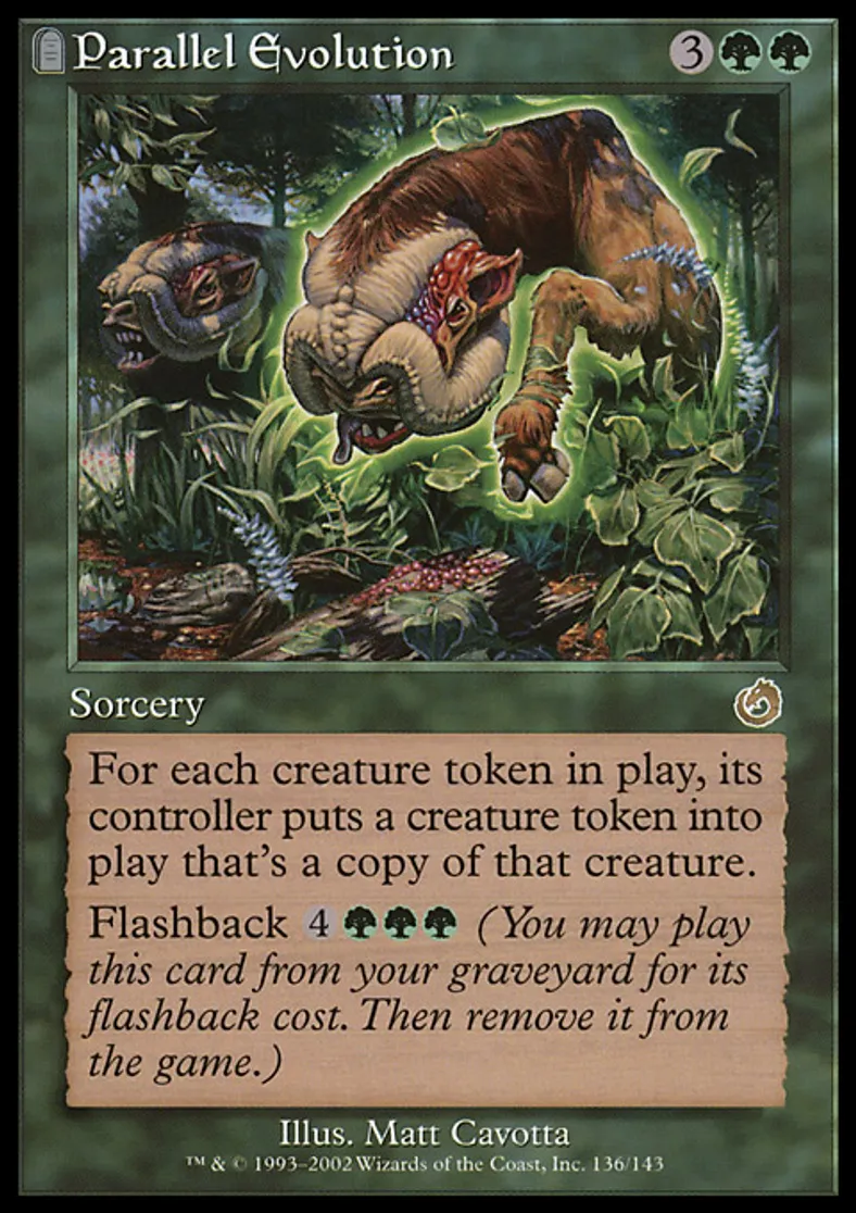 | Oracle Text | For each creature token on the battlefield, its controller puts a token that's a copy of that creature onto the battlefield. Flashback {{4}}{{g}}{{g}}{{g}} (You may cast this card from your graveyard for its flashback cost. Then exile it.) | ||