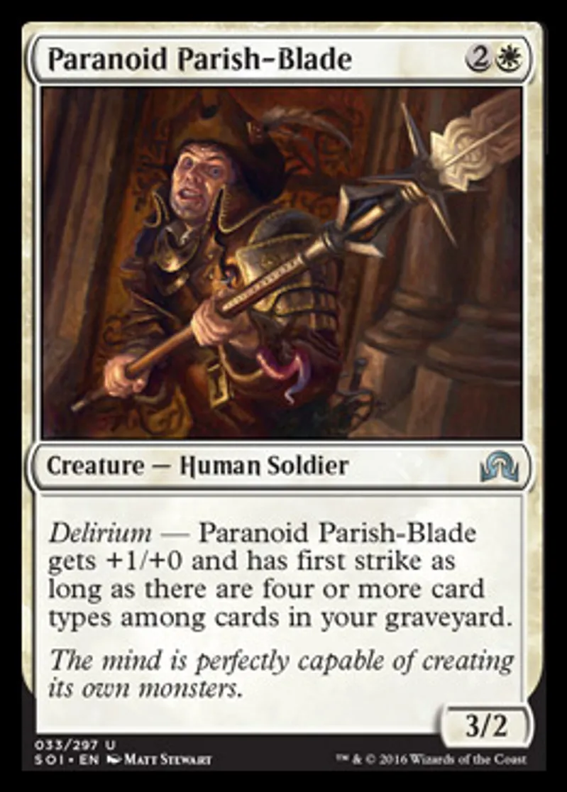 Magic: the Gathering (mtg) Uncommon Creature - Human Soldier Paranoid Parish-Blade from Shadows over Innistrad (SOI) last updated 2026-02-21 17:24:02