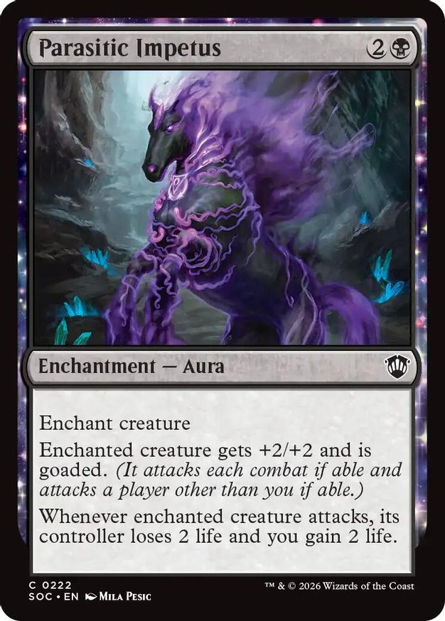 Magic: the Gathering (mtg) Common enchantment — aura Parasitic Impetus from Commander: Secrets of Strixhaven (SOC) last updated 2026-04-17 00:23:35