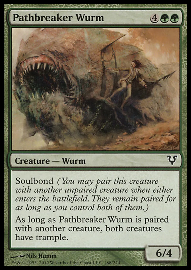 | Oracle Text | Soulbond (You may pair this creature with another unpaired creature when either enters the battlefield. They remain paired for as long as you control both of them.) As long as Pathbreaker Wurm is paired with another creature, both creatures have trample. | ||