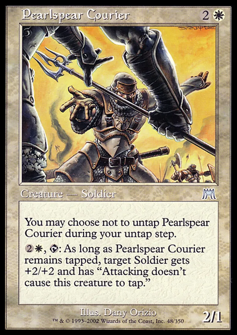 | Oracle Text | You may choose not to untap Pearlspear Courier during your untap step. {{2}}{{w}}, {{t}}: Target Soldier creature gets +2/+2 and has vigilance for as long as Pearlspear Courier remains tapped. | ||