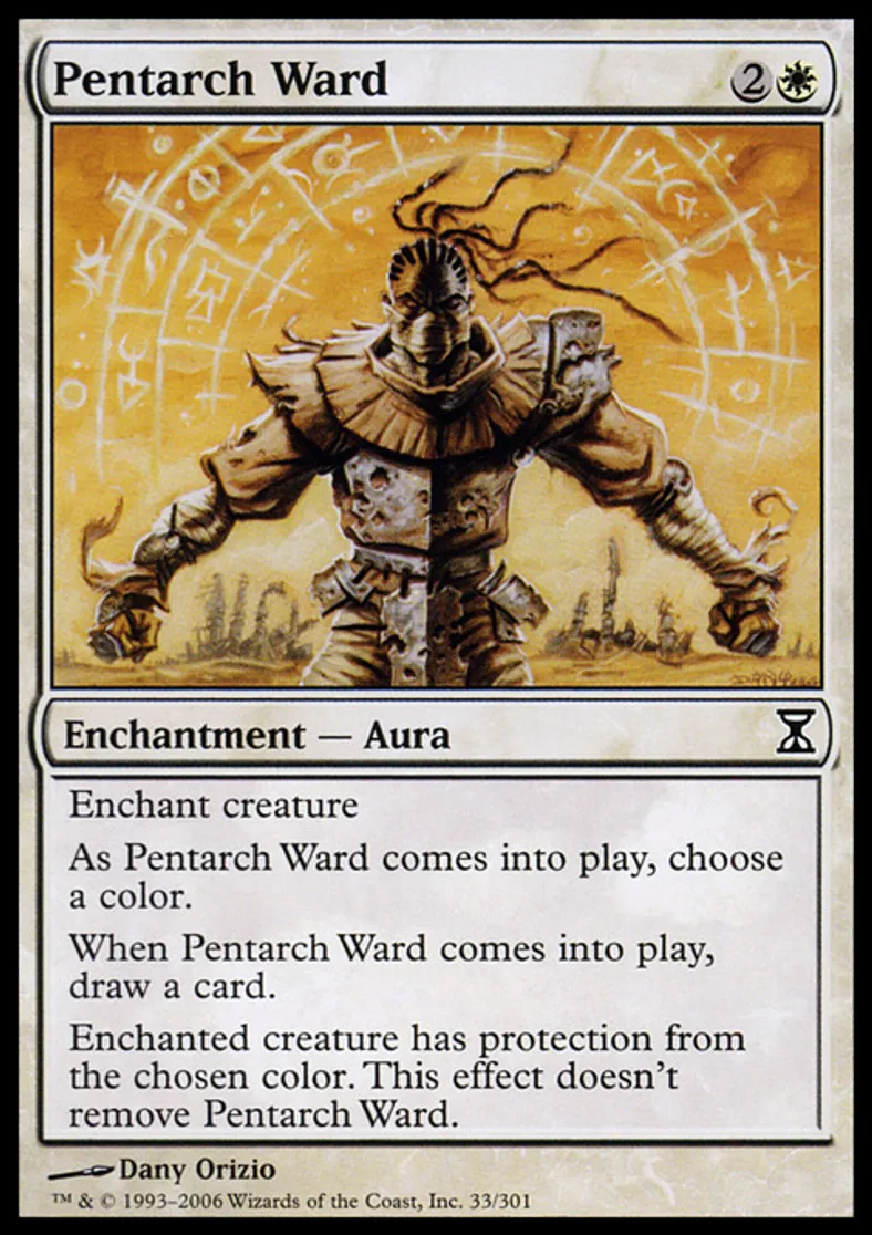 | Oracle Text | Enchant creature As Pentarch Ward enters the battlefield, choose a color. When Pentarch Ward enters the battlefield, draw a card. Enchanted creature has protection from the chosen color. This effect doesn't remove Pentarch Ward. | ||