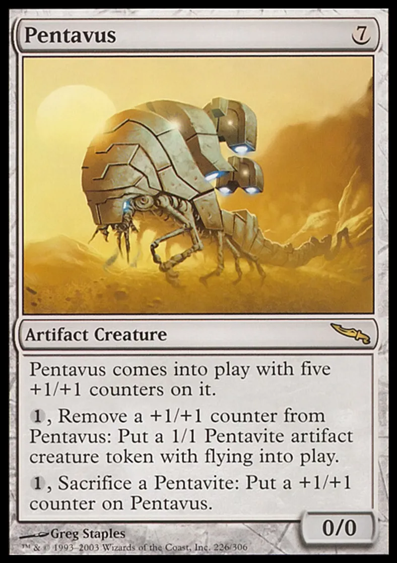| Oracle Text | Pentavus enters the battlefield with five +1/+1 counters on it. {{1}}, Remove a +1/+1 counter from Pentavus: Put a 1/1 colorless Pentavite artifact creature token with flying onto the battlefield. {{1}}, Sacrifice a Pentavite: Put a +1/+1 counter on Pentavus. | ||