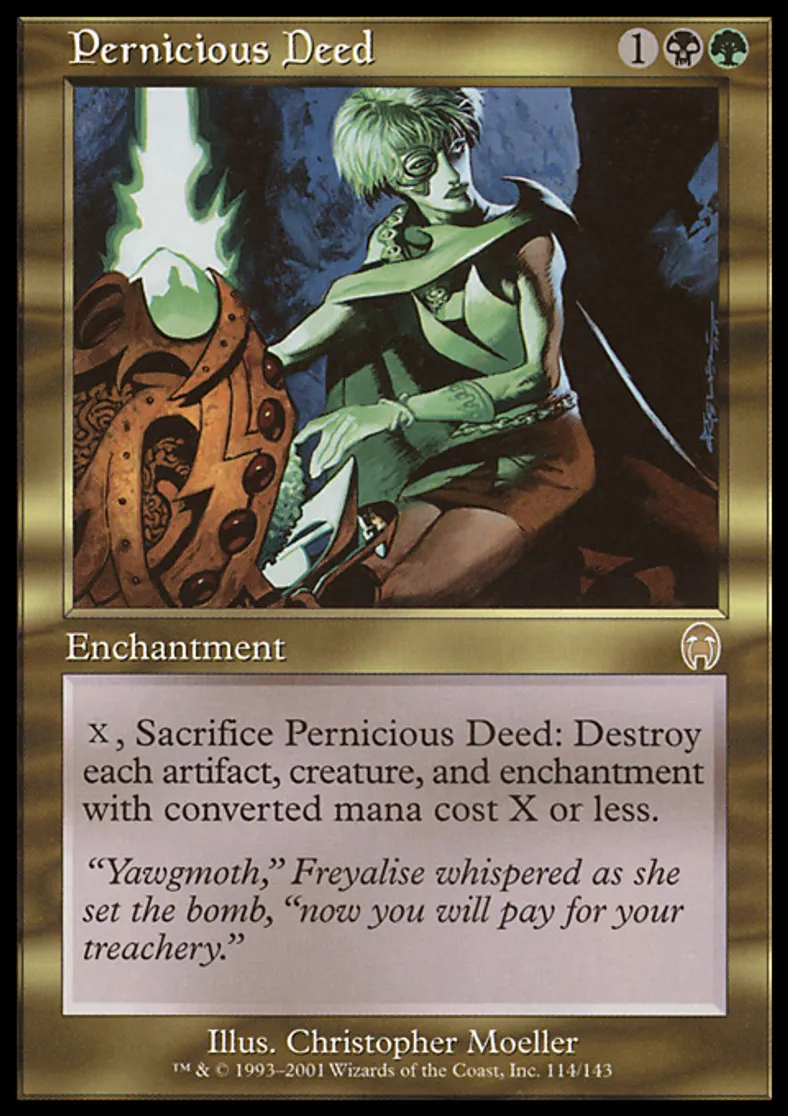 | Oracle Text | {{x}}, Sacrifice Pernicious Deed: Destroy each artifact, creature, and enchantment with converted mana cost X or less. | ||