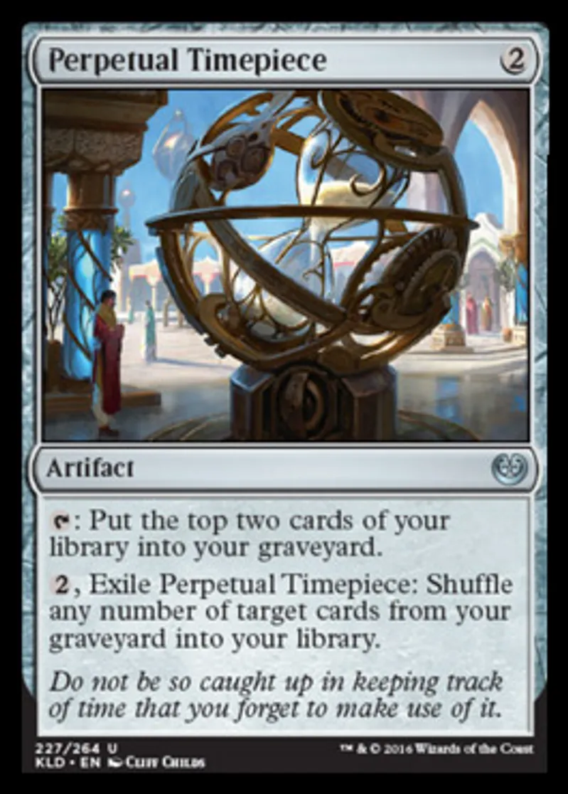 | Oracle Text | {{t}}: Put the top two cards of your library into your graveyard. {{2}}, Exile Perpetual Timepiece: Shuffle any number of target cards from your graveyard into your library. | ||
