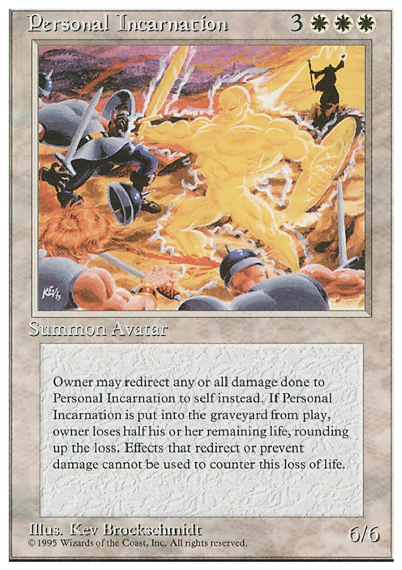| Oracle Text | {{0}}: The next 1 damage that would be dealt to Personal Incarnation this turn is dealt to its owner instead. Any player may activate this ability, but only if he or she owns Personal Incarnation. When Personal Incarnation dies, its owner loses half his or her life, rounded up. | ||