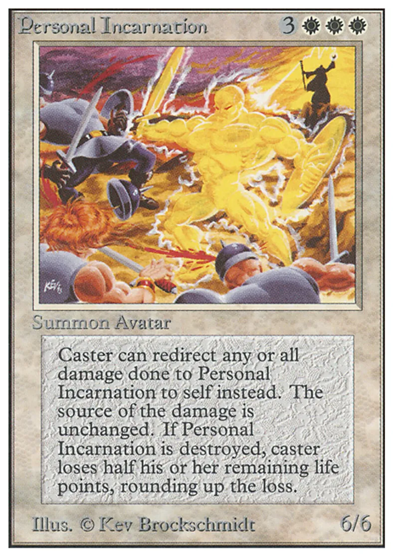 | Oracle Text | {{0}}: The next 1 damage that would be dealt to Personal Incarnation this turn is dealt to its owner instead. Any player may activate this ability, but only if he or she owns Personal Incarnation. When Personal Incarnation dies, its owner loses half his or her life, rounded up. | ||