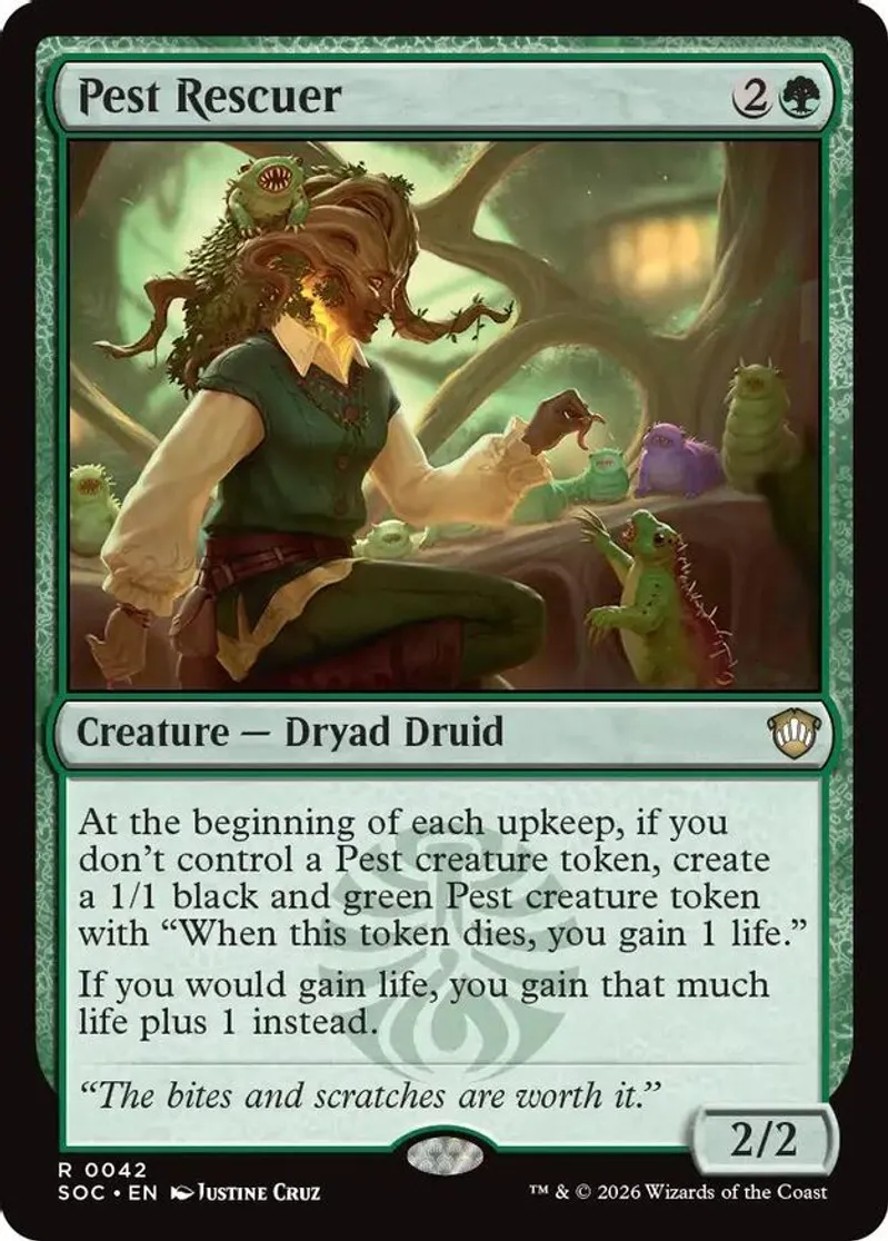Magic: the Gathering (mtg) Rare creature — dryad druid Pest Rescuer from Commander: Secrets of Strixhaven (SOC) last updated 2026-04-17 00:18:40