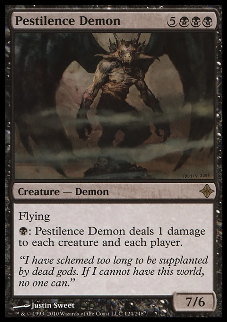 | Oracle Text | Flying {{b}}: Pestilence Demon deals 1 damage to each creature and each player. | ||