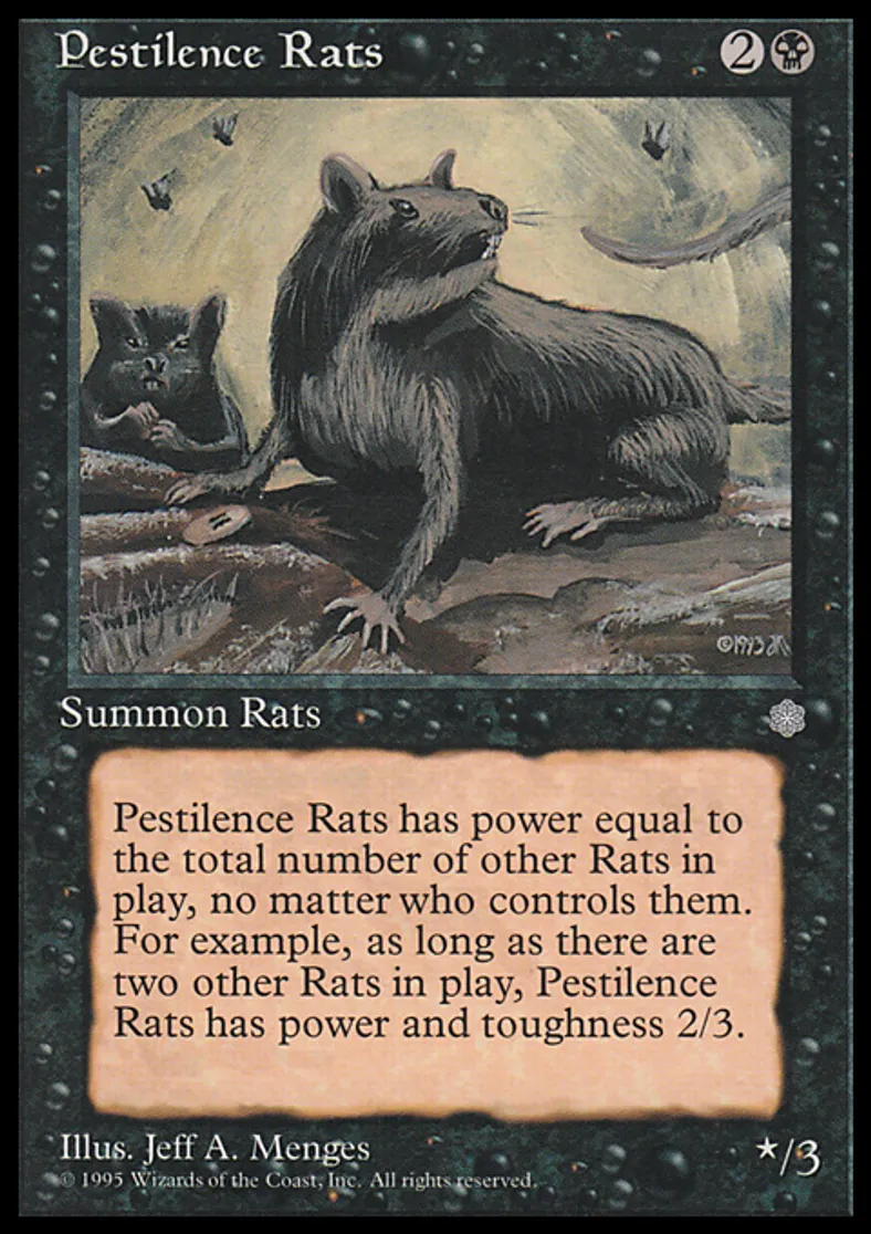 | Oracle Text | Pestilence Rats's power is equal to the number of other Rats on the battlefield. (For example, as long as there are two other Rats on the battlefield, Pestilence Rats's power and toughness are 2/3.) | ||