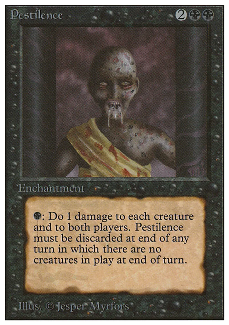 | Oracle Text | At the beginning of the end step, if no creatures are on the battlefield, sacrifice Pestilence. {{b}}: Pestilence deals 1 damage to each creature and each player. | ||