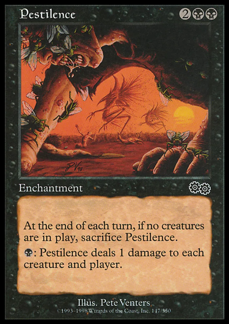 | Oracle Text | At the beginning of the end step, if no creatures are on the battlefield, sacrifice Pestilence. {{b}}: Pestilence deals 1 damage to each creature and each player. | ||