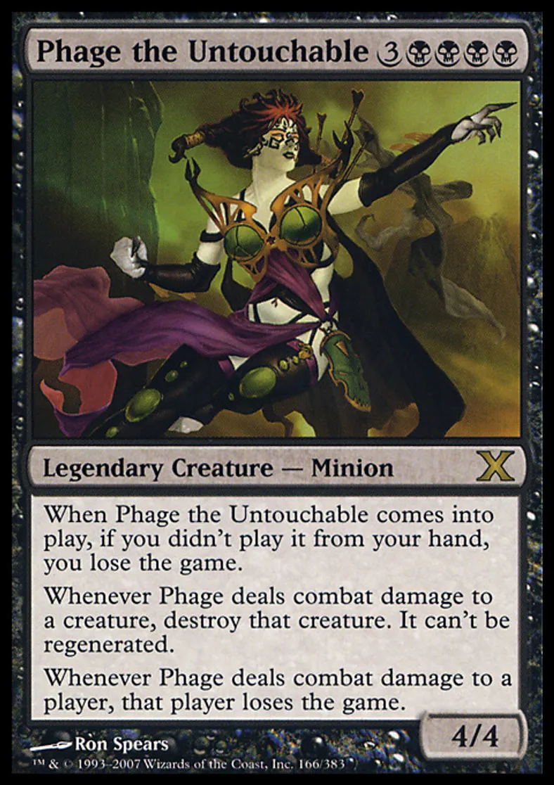 | Oracle Text | When Phage the Untouchable enters the battlefield, if you didn't cast it from your hand, you lose the game. Whenever Phage deals combat damage to a creature, destroy that creature. It can't be regenerated. Whenever Phage deals combat damage to a player, that player loses the game. | ||