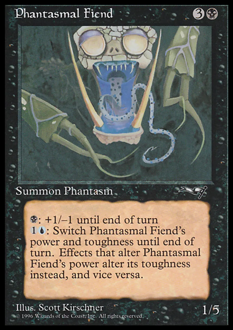 | Oracle Text | {{b}}: Phantasmal Fiend gets +1/-1 until end of turn. {{1}}{{u}}: Switch Phantasmal Fiend's power and toughness until end of turn. | ||