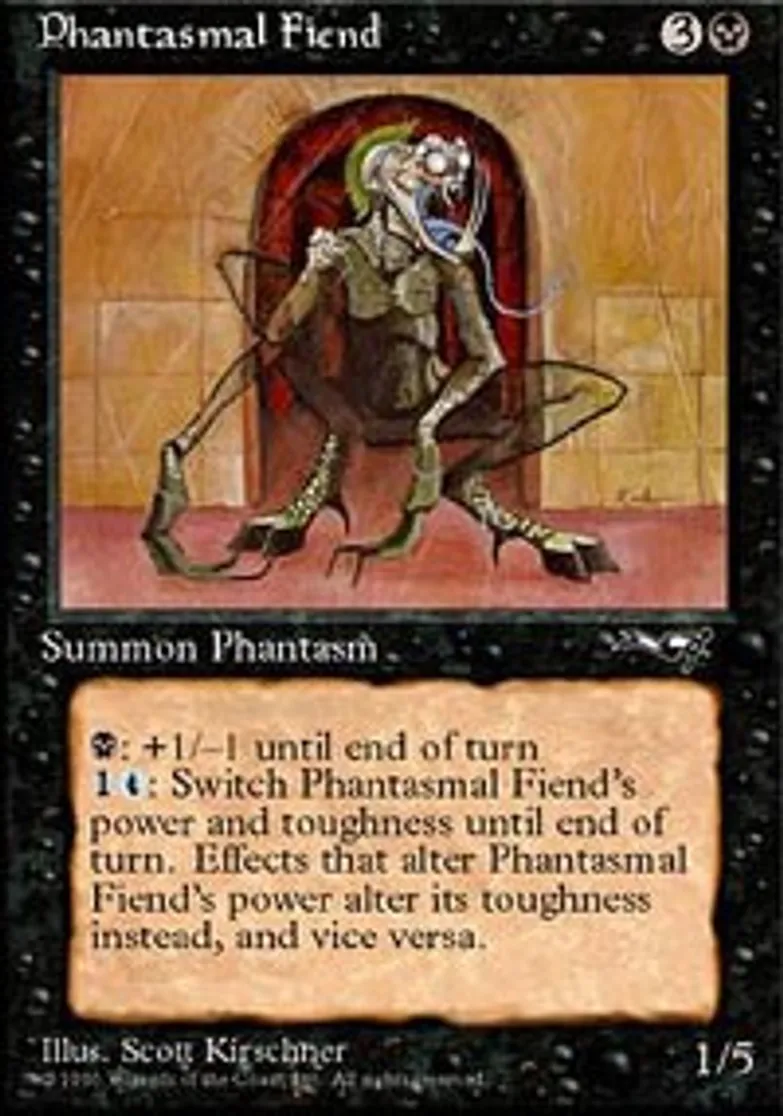 | Oracle Text | {{b}}: +1/-1 until end of turn1{{u}}: Switch Phantasmal Fiend's power and toughness until end of turn. Effects that alter Phantasmal Fiend's power alter its toughness instead, and vice versa. | ||