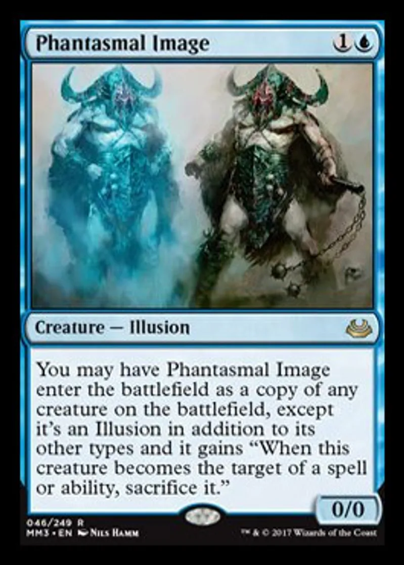 | Oracle Text | You may have Phantasmal Image enter the battlefield as a copy of any creature on the battlefield, except it's an Illusion in addition to its other types and it gains "When this creature becomes the target of a spell or ability, sacrifice it." | ||