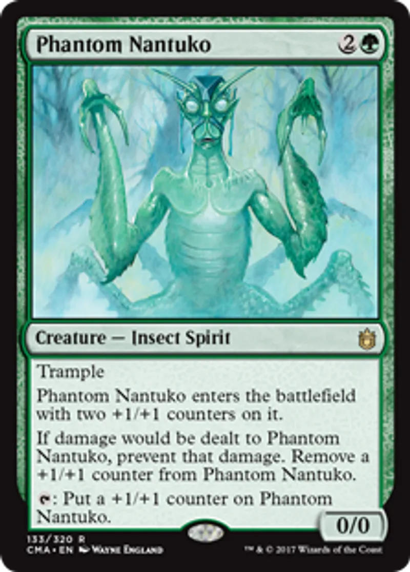 | Oracle Text | Trample Phantom Nantuko enters the battlefield with two +1/+1 counters on it. If damage would be dealt to Phantom Nantuko, prevent that damage. Remove a +1/+1 counter from Phantom Nantuko. {{t}}: Put a +1/+1 counter on Phantom Nantuko. | ||