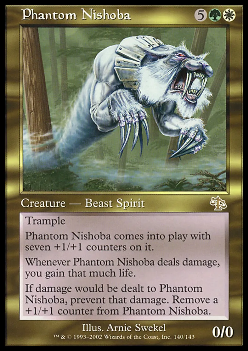 | Oracle Text | Trample Phantom Nishoba enters the battlefield with seven +1/+1 counters on it. Whenever Phantom Nishoba deals damage, you gain that much life. If damage would be dealt to Phantom Nishoba, prevent that damage. Remove a +1/+1 counter from Phantom Nishoba. | ||