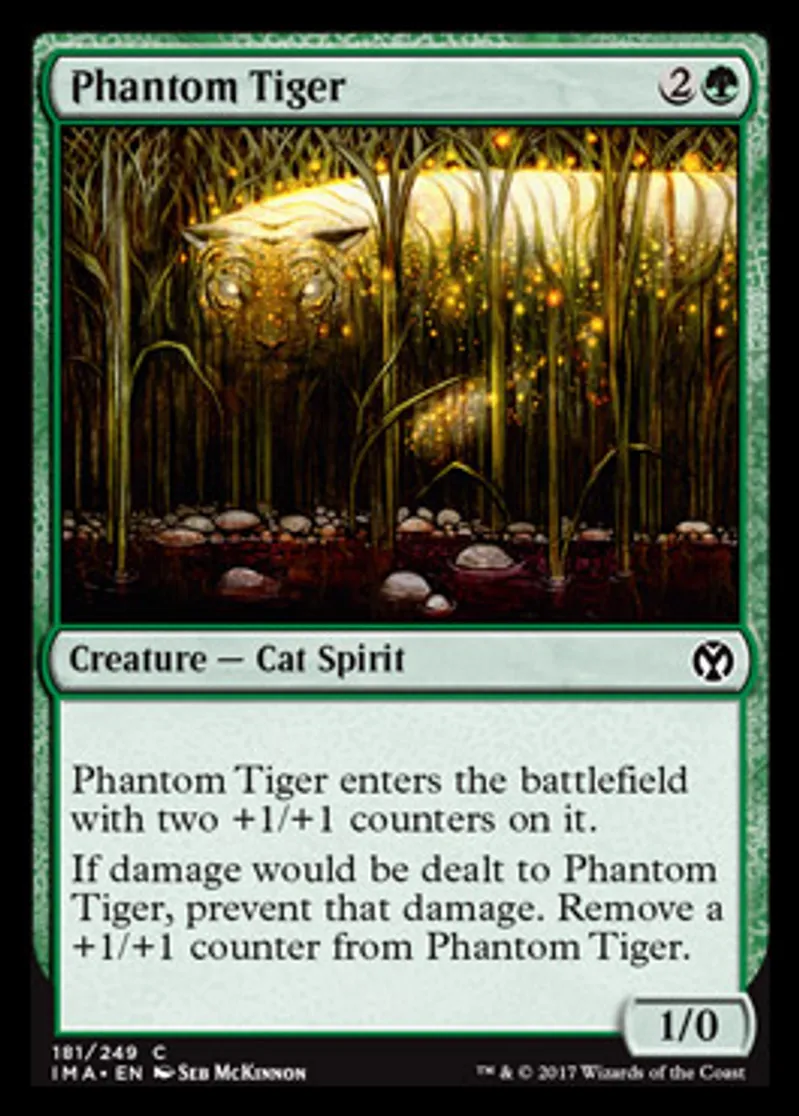 | Oracle Text | Phantom Tiger enters the battlefield with two +1/+1 counters on it. If damage would be dealt to Phantom Tiger, prevent that damage. Remove a +1/+1 counter from Phantom Tiger. | ||