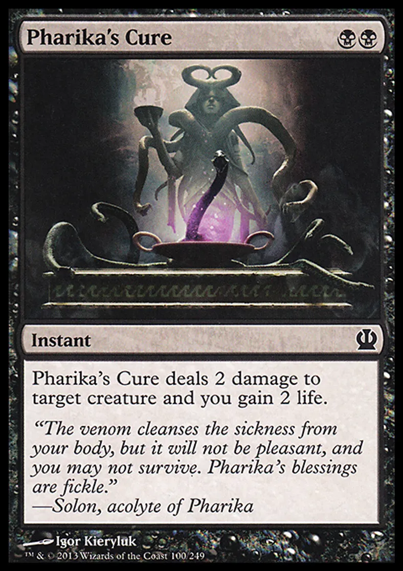 | Oracle Text | Pharika's Cure deals 2 damage to target creature and you gain 2 life. | ||