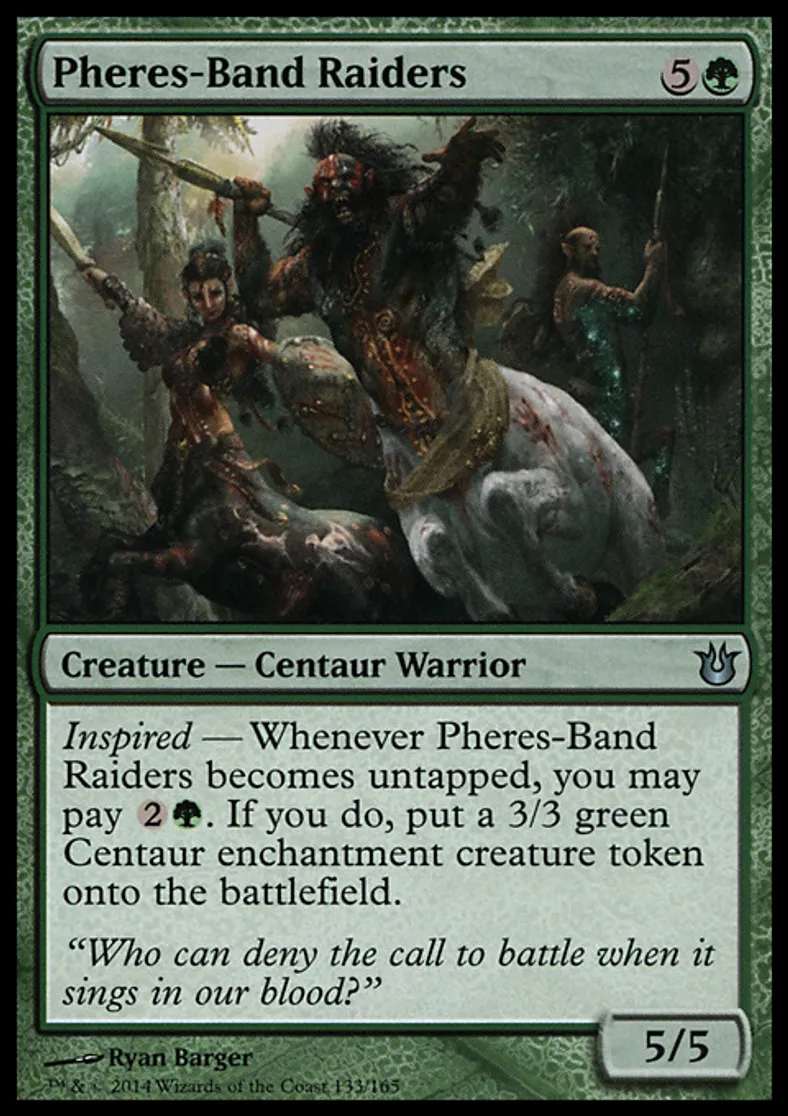 | Oracle Text | Inspired — Whenever Pheres-Band Raiders becomes untapped, you may pay {{2}}{{g}}. If you do, put a 3/3 green Centaur enchantment creature token onto the battlefield. | ||
