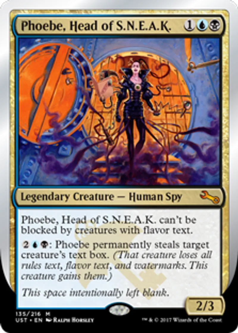 | Oracle Text | Phoebe, Head of S.N.E.A.K. can't be blocked by creatures with flavor text. {{2}}{{u}}{{b}}: Phoebe permanently steals target creature's text box. (That creature loses all rules text, flavor text, and watermarks. This creature gains them.) | ||