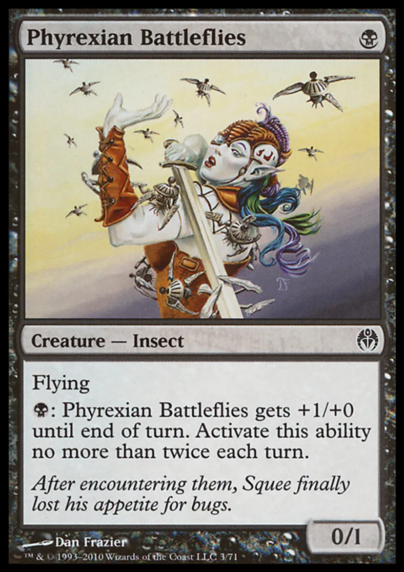 | Oracle Text | Flying {{b}}: Phyrexian Battleflies gets +1/+0 until end of turn. Activate this ability no more than twice each turn. | ||