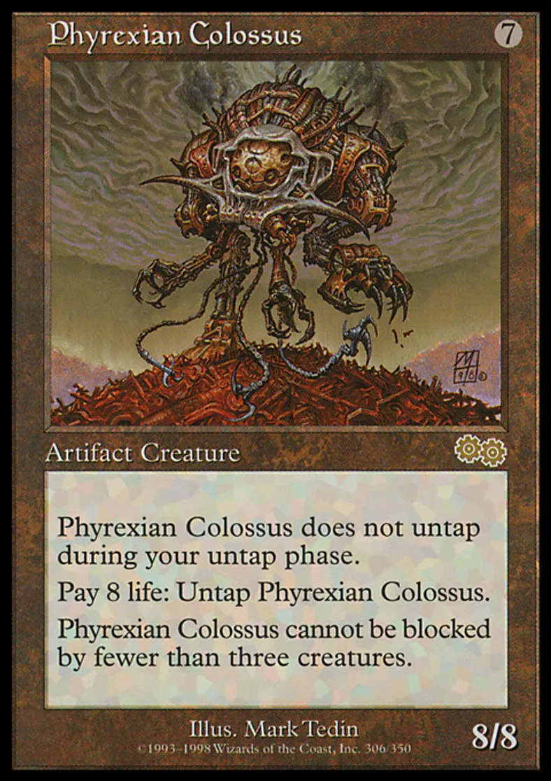 | Oracle Text | Phyrexian Colossus doesn't untap during your untap step. Pay 8 life: Untap Phyrexian Colossus. Phyrexian Colossus can't be blocked except by three or more creatures. | ||