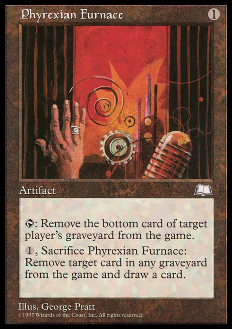 | Oracle Text | {{t}}: Exile the bottom card of target player's graveyard. {{1}}, Sacrifice Phyrexian Furnace: Exile target card from a graveyard. Draw a card. | ||