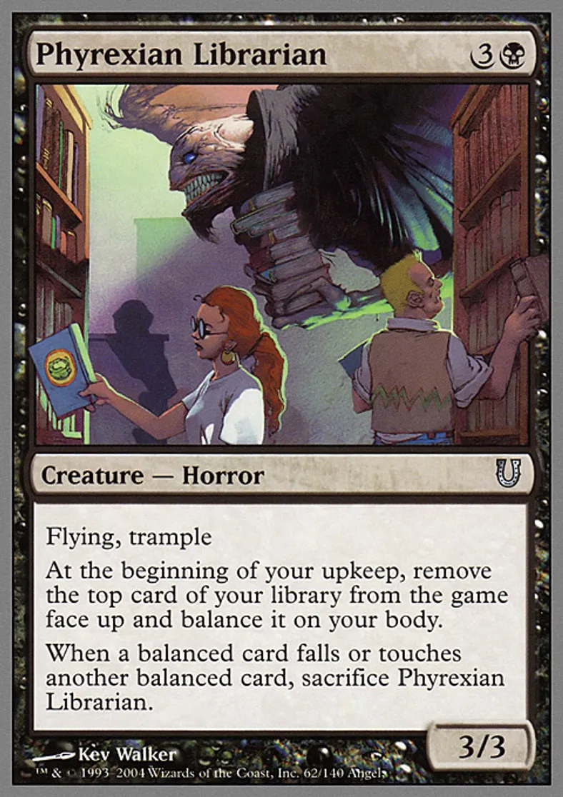 | Oracle Text | Flying, trample At the beginning of your upkeep, remove the top card of your library from the game face up and balance it on your body. When a balanced card falls or touches another balanced card, sacrifice Phyrexian Librarian. | ||
