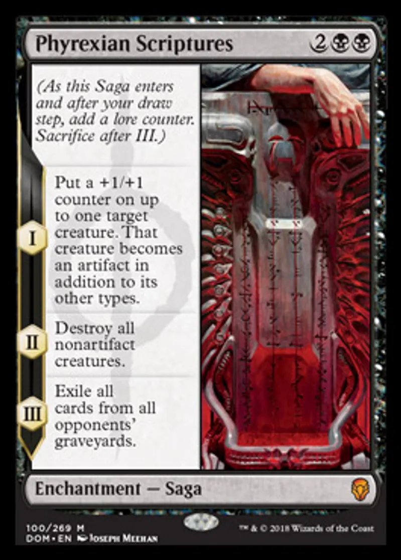 Magic: the Gathering (mtg) Mythic Rare Enchantment - Saga Phyrexian Scriptures from Dominaria (DOM) last updated 2026-02-12 14:38:36