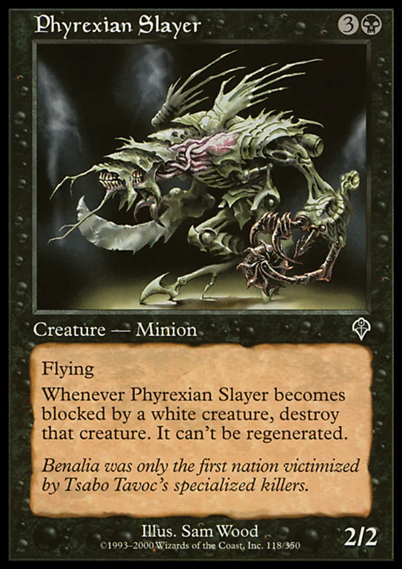 | Oracle Text | Flying Whenever Phyrexian Slayer becomes blocked by a white creature, destroy that creature. It can't be regenerated. | ||