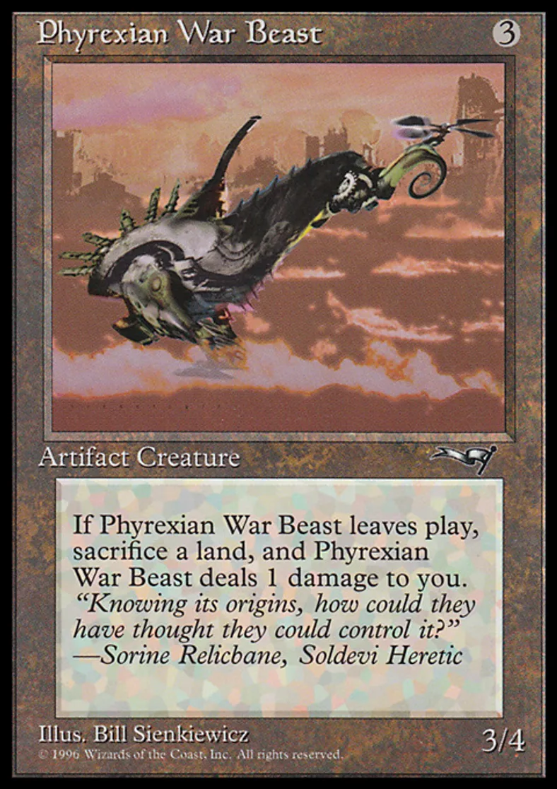 | Oracle Text | When Phyrexian War Beast leaves the battlefield, sacrifice a land and Phyrexian War Beast deals 1 damage to you. | ||