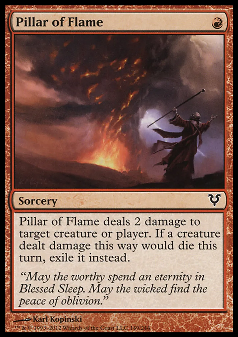 | Oracle Text | Pillar of Flame deals 2 damage to target creature or player. If a creature dealt damage this way would die this turn, exile it instead. | ||