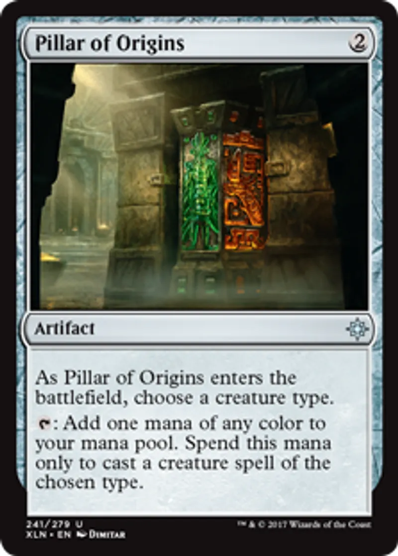 | Oracle Text | As Pillar of Origins enters the battlefield, choose a creature type. {{t}}: Add one mana of any color to your mana pool. Spend this mana only to cast a creature spell of the chosen type. | ||