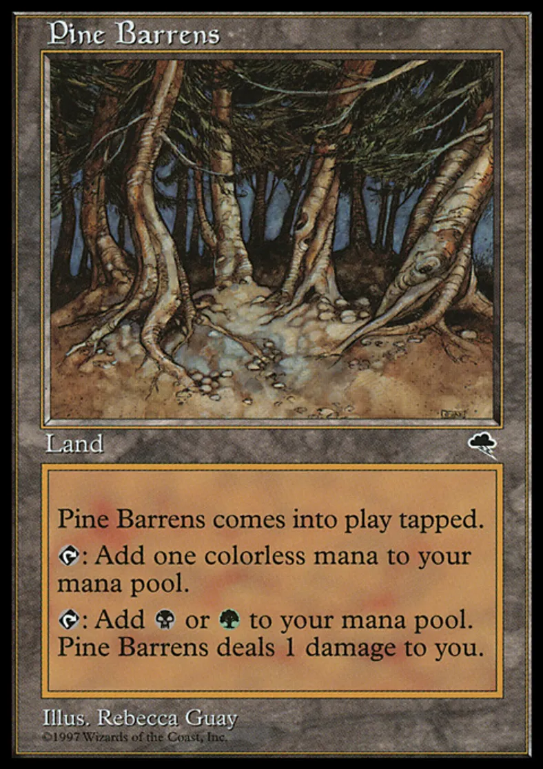 | Oracle Text | Pine Barrens enters the battlefield tapped. {{t}}: Add {{1}} to your mana pool. {{t}}: Add {{b}} or {{g}} to your mana pool. Pine Barrens deals 1 damage to you. | ||