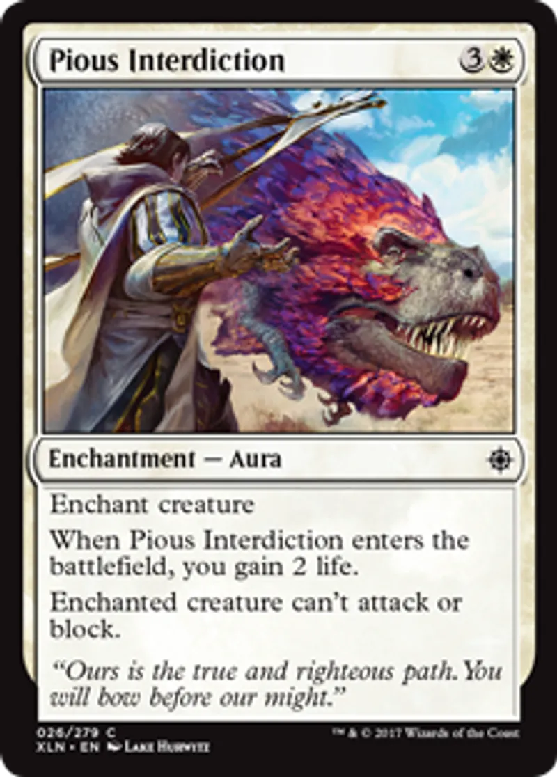 Magic: the Gathering (mtg) Common Enchantment - Aura Pious Interdiction from Ixalan (XLN) last updated 2026-02-21 16:48:04