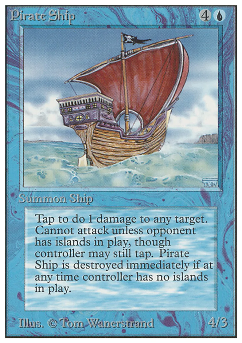 | Oracle Text | Pirate Ship can't attack unless defending player controls an Island. {{t}}: Pirate Ship deals 1 damage to target creature or player. When you control no Islands, sacrifice Pirate Ship. | ||