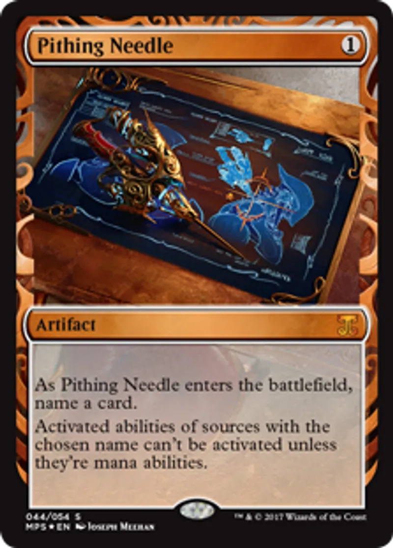 | Oracle Text | As Pithing Needle enters the battlefield, name a card. Activated abilities of sources with the chosen name can't be activated unless they're mana abilities. | ||