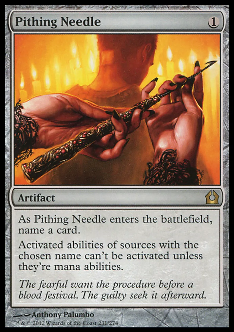 | Oracle Text | As Pithing Needle enters the battlefield, name a card. Activated abilities of sources with the chosen name can't be activated unless they're mana abilities. | ||