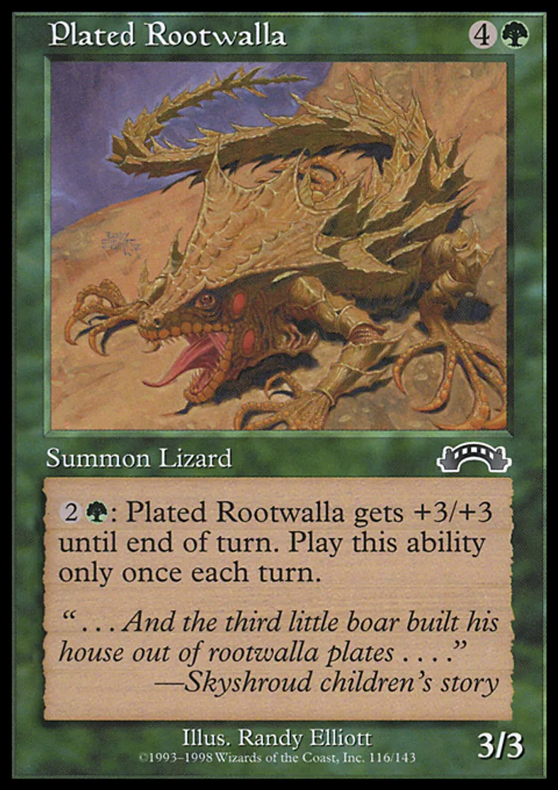 | Flavor Text | " . . . And the third little boar built his house out of rootwalla plates . . . ."—Skyshroud children's story | ||