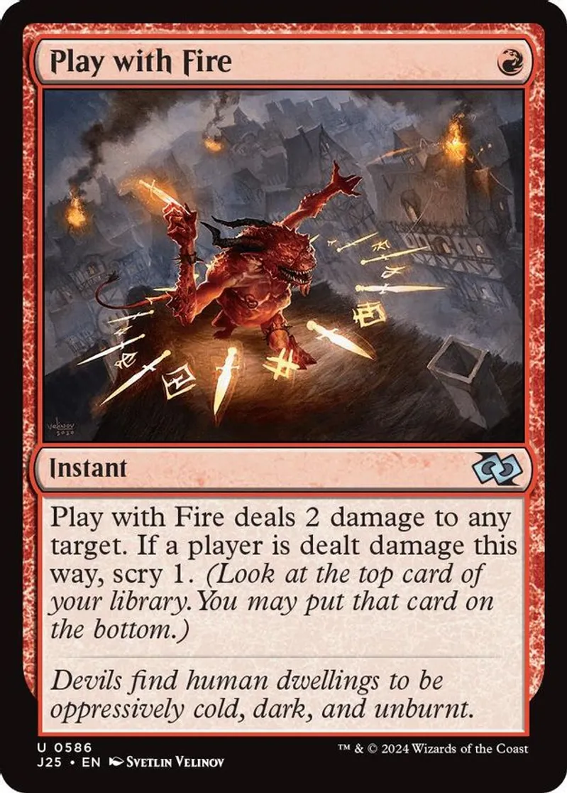| Oracle Text | play with fire deals 2 damage to any target. if a player is dealt damage this way, scry 1. (look at the top card of your library. you may put that card on the bottom.) | ||