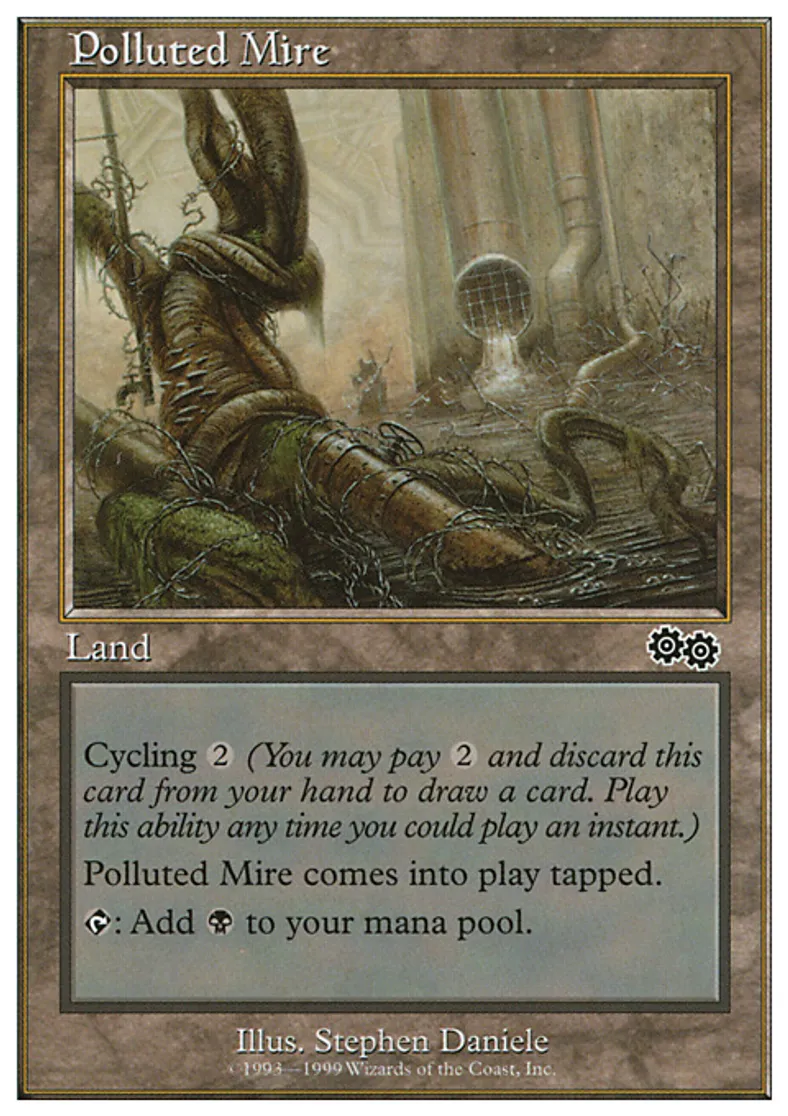 | Oracle Text | Polluted Mire enters the battlefield tapped. {{t}}: Add {{b}} to your mana pool. Cycling {{2}} ({{2}}, Discard this card: Draw a card.) | ||